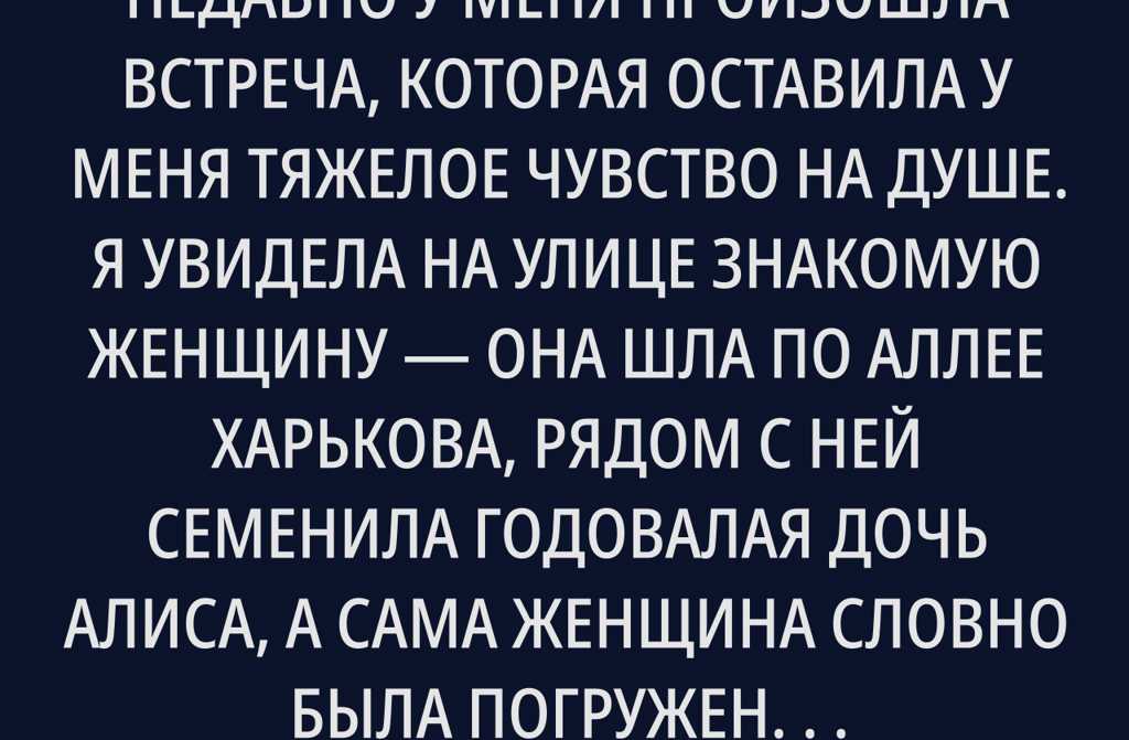Здравствуйте, мой друг. Недавно у меня произошла встреча, которая оставила у меня тяжелое чувство на душе. Я увидела на улице знакомую женщину она шла по аллее Харькова, рядом с ней семенила годовалая дочь Алиса, а сама женщина словно была погружена в свои мысли, ничего не замечая вокруг. Если бы я ее не позвала по имени, то она бы прошла мимо меня, не обратив внимания.