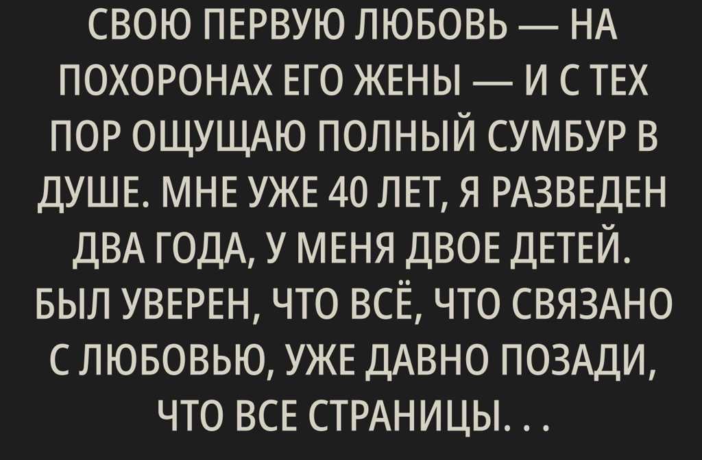 Неделю назад я снова встретил свою первую любовь на похоронах его жены и с тех пор ощущаю полный сумбур в душе. Мне уже 40 лет, я разведен два года, у меня двое детей. Был уверен, что всё, что связано с любовью, уже давно позади, что все страницы закрыты. Но стоило увидеть его вновь, чтобы понять: некоторые истории никогда не заканчиваются до конца.
