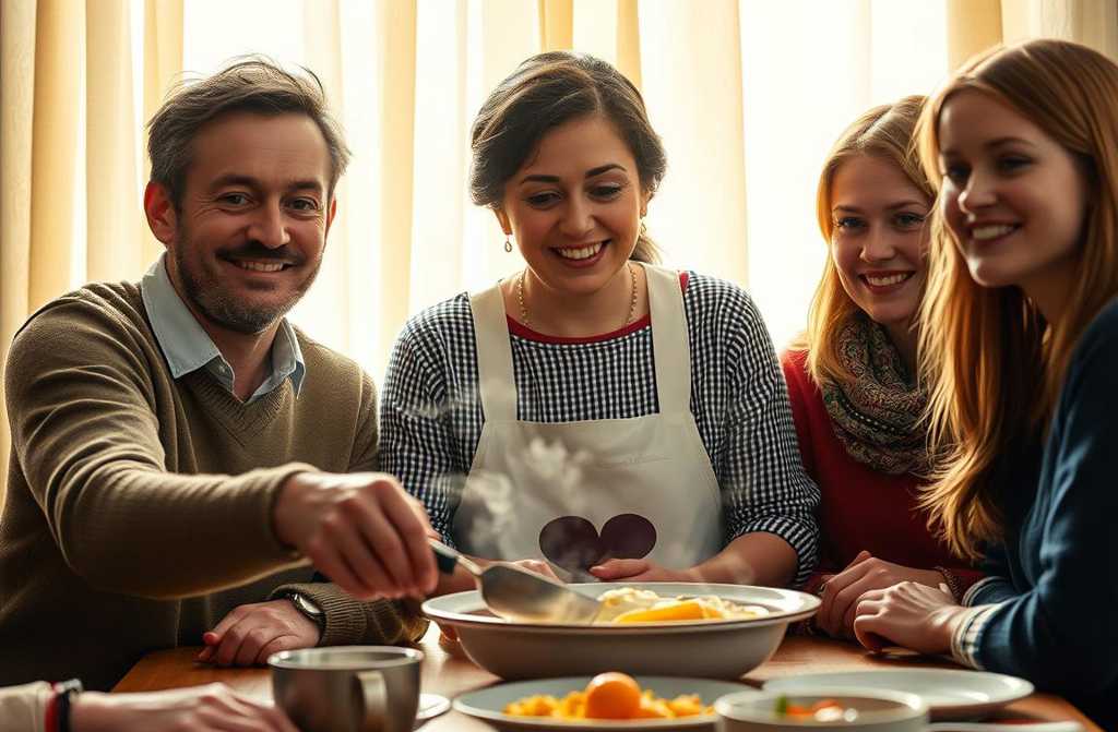 Татьяна ставит на стол тарелку с омлетом, садится напротив Максима Смирнова. Солнечный свет пробивается сквозь лёгкую штору, заливая комнату тёплым золотистым светом. Она подкладывает подбородок рукой и улыбается.