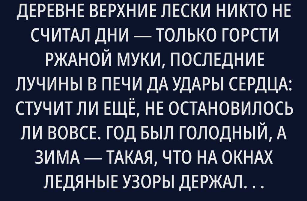 В ту зиму, когда ходили слухи, что в соседних деревнях уже пухнут от голода, Фёдор мотался между райцентром и Верхними Лесками, выклянчивая у начальства дополнительную пайку для односельчан. Он нутром чуял: люди на исходе, и стоит кому-то начать таскать по закоулкам не миновать беды и стихийного бунта. Он этого боялся не ради должности знал: если покатится разбой, то все раздобудут понемногу, а уже к весне останется только чистое поле да слёзы.