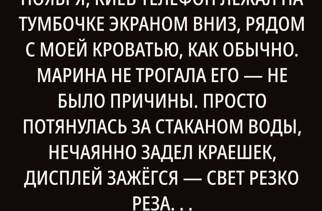 Телефон лежал на тумбочке экраном вниз, рядом с моей кроватью, как обычно. Марина не трогала его не было причины. Просто потянулась за стаканом воды, нечаянно задел краешек, дисплей зажёгся свет резко резанул ночную полутьму. Часто бывает: то, что лучше бы оставалось в тени, вдруг проявляется само.