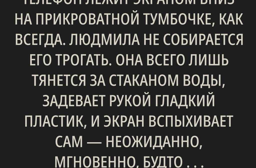 Телефон лежит экраном вниз на прикроватной тумбочке, как всегда. Людмила не собирается его трогать. Она всего лишь тянется за стаканом воды, задевает рукой гладкий пластик, и экран вспыхивает сам неожиданно, мгновенно, будто нечто скрытое решило вырваться наружу.