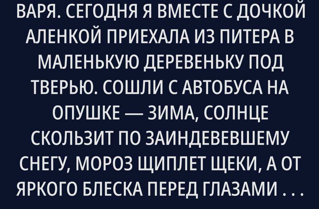 Меня зовут Варя. Сегодня я вместе с дочкой Аленкой приехала из Питера в маленькую деревеньку под Тверью. Сошли с автобуса на опушке зима, солнце скользит по заиндевевшему снегу, мороз щиплет щеки, а от яркого блеска перед глазами белесая пелена: Аленка щурится, кутается в шарф.
