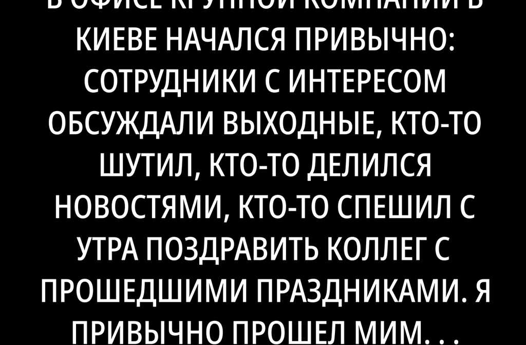 Понедельник в офисе крупной компании в Киеве начался привычно: сотрудники с интересом обсуждали выходные, кто-то шутил, кто-то делился новостями, кто-то спешил с утра поздравить коллег с прошедшими праздниками. Я привычно прошел мимо открытого окна, почувствовал запах кофе и услышал, как кто-то с восторгом рассказывает о поездке на дачу. Кому-то выпало сходить в театр и попробовать киевский торт в любимом кафе, кто-то просто наконец выспался.