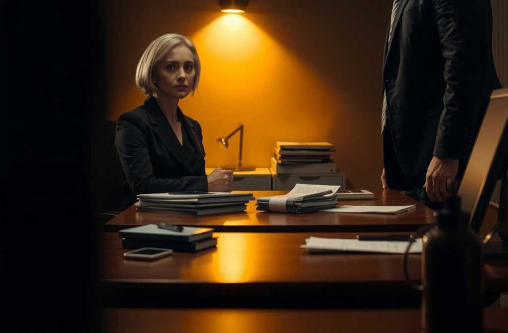 Арина складывает документы, выравнивает края, как в ритуале; спокойно встречает его взгляд.