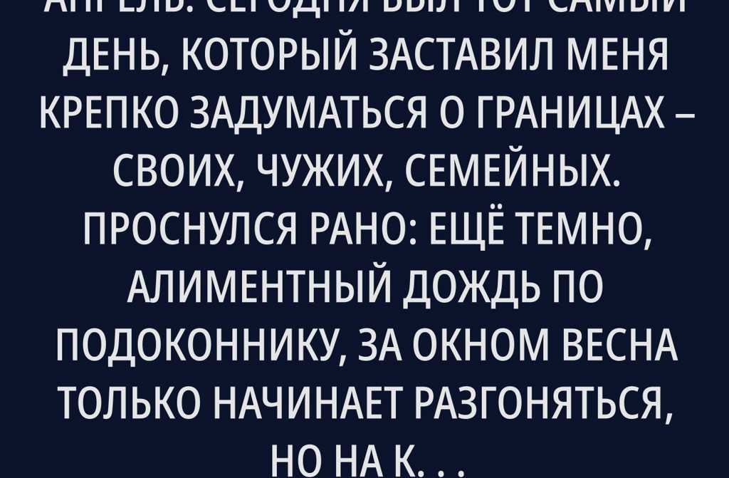 Сегодня был тот самый день, который заставил меня крепко задуматься о границах своих, чужих, семейных. Проснулся рано: ещё темно, алиментный дождь по подоконнику, за окном весна только начинает разгоняться, но на кухне уже слышатся тихие шаркающие шаги.