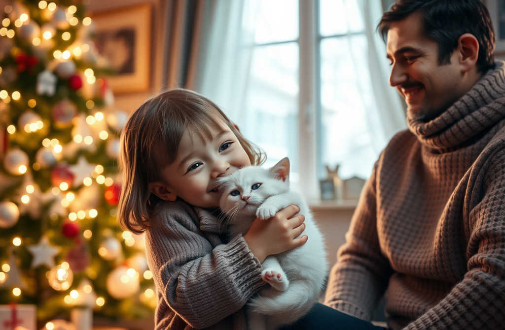 Рядом с искрящейся ёлкой, будто снег, лежал белый котёнок.