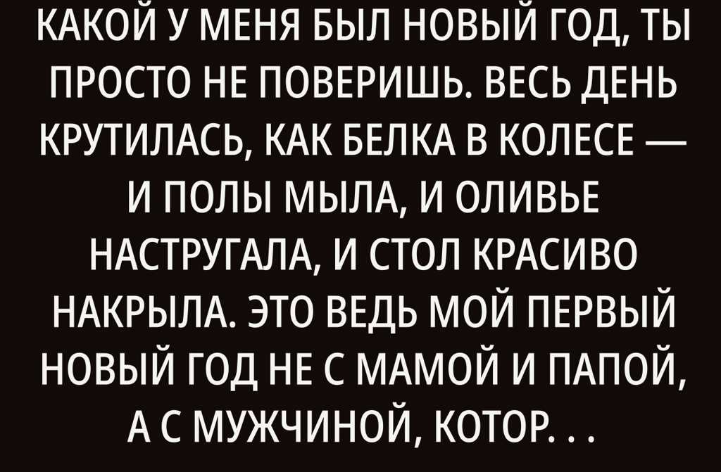 Слушай, хочу тебе рассказать, какой у меня был Новый год, ты просто не поверишь. Весь день крутилась, как белка в колесе и полы мыла, и оливье настругала, и стол красиво накрыла. Это ведь мой первый Новый год не с мамой и папой, а с мужчиной, которого люблю.