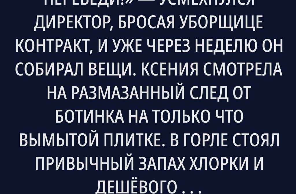 Ксения смотрела на размазанный след от ботинка на только что вымытой плитке. В горле стоял привычный запах хлорки и дешёвого мыла. Ей было тридцать два, и последние пять лет жизни мерялись количеством вымытых лестничных пролётов и весом ведра.