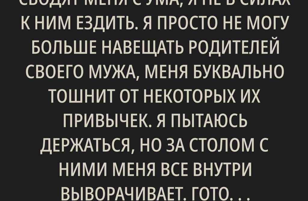 Я просто не могу больше навещать родителей своего мужа, меня буквально тошнит от некоторых их привычек. Я пытаюсь держаться, но за столом с ними меня все внутри выворачивает. Готова разговаривать с ними, общаться, но ужинать за их столом для меня пытка. Муж этого не видит, а свекровь считает меня избалованной и чопорной девицей, которая не умеет себя вести.