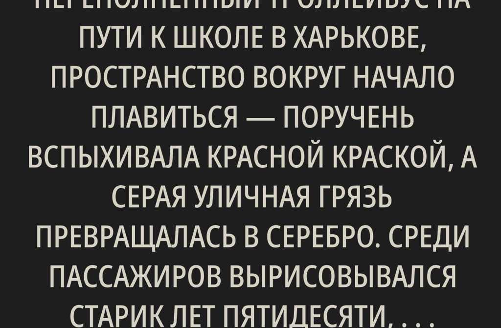 Пока я поднималась в переполненный троллейбус на пути к школе в Харькове, пространство вокруг начало плавиться поручень вспыхивала красной краской, а серая уличная грязь превращалась в серебро. Среди пассажиров вырисовывался старик лет пятидесяти, который судорожно пытался удержаться за поручень, превращавшийся в лозу винограда. Сначала мне показалось, что он пьян, но его движения были слишком странные как будто в его ногах таяли облака. Мы будто по сонной логике вышли на одной и той же остановке «Проспект Победы», и мой интерес подтянул меня за ним, словно ветер по аллее.