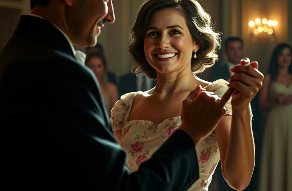Толпа замолчала, а её дрожащие пальцы чуть не отпускали крепко сжатую руку. Шёпот удивления пронёсся по залу, когда Дмитрий повёл её к центру танцевального круга. Оркестр сменил мелодию, заполняя воздух медленной, томительной балладой.