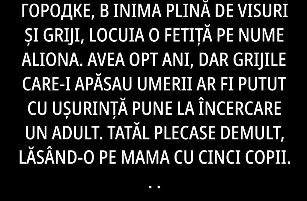 В маленьком украинском городке, в inima plină de visuri și griji, locuia o fetiță pe nume Aliona. Avea opt ani, dar grijile care-i apăsau umerii ar fi putut cu ușurință pune la încercare un adult. Tatăl plecase demult, lăsând-o pe mama cu cinci copii și un buget mai subțire decât firul de iarbă printre betoane. Fiecare zi se transforma într-un fel de sport extrem: cine prinde primul bucata de pâine, scapă flămând doar la cină.