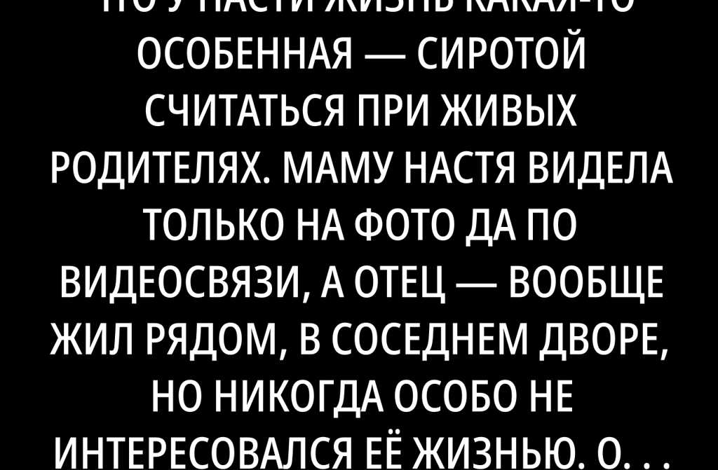 Знаешь, мне всегда казалось, что у Насти жизнь какая-то особенная сиротой считаться при живых родителях. Маму Настя видела только на фото да по видеосвязи, а отец вообще жил рядом, в соседнем дворе, но никогда особо не интересовался её жизнью.