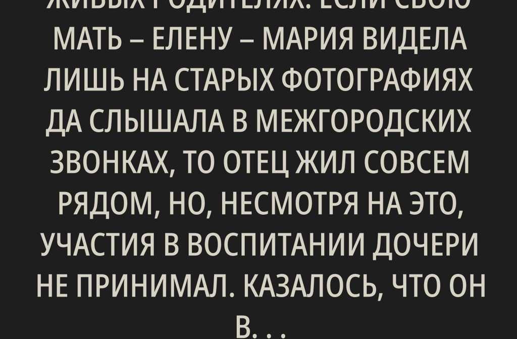Мария выросла сиротой при живых родителях. Если свою мать Елену Мария видела лишь на старых фотографиях да слышала в межгородских звонках, то отец жил совсем рядом, но, несмотря на это, участия в воспитании дочери не принимал.