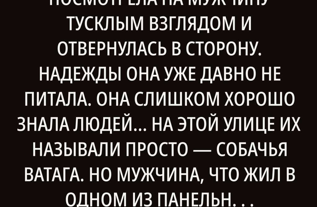 На что может надеяться дворняга, которую однажды выбросили на улицу? А они всё равно продолжали верить. Любили, несмотря ни на что. Потому я никогда не выходил к ним с пустыми руками они ждали меня, и всегда дожидались.