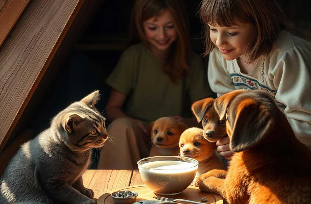 О, какие у нас гости! Ты тоже голоден, котик, воскликнула она. Оказалось, что Барсик сидел почти у миски, не сумев убежать далеко. Он настороженно посмотрел на девочку, а она, не обращая на него внимания, угощала щенков. Барсик доел украденный кусок и вернулся к миске.