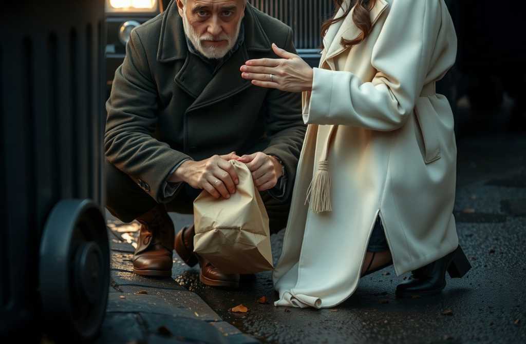 Эта сцена заставляет прохожих по улице Ленина остановиться и затаить дыхание. Блестящая чёрная машина плавно подруливает к обочине рядом с парком, где у мусорного бака замёрз старик-бездомный, кутаясь в рваный пуховик. Дверь открывается, и из салона выходит женщина. На ней ослепительно белое пальто, сшитое словно на заказ где-то в Москве.
