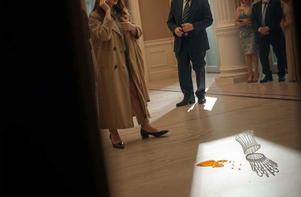 Зал был переполнен блеском ювелирных украшений. Анастасия появилась в притягательном золотистом платье, а рядом с ней находился её спутник Дмитрий. Они попивали коллекционный коньяк и обсуждали гостей, весело хихикая. Но их весёлый разговор резко прервался, когда в зале появилась молодая девушка по имени Олеся. Она была одета в простое, уже потёртое светло-бежевое пальто и обычные туфли без каблуков.