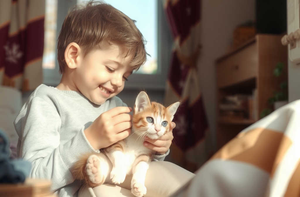 Кошка поняла, что мальчик не причинит зла ни ей, ни малышу, подошла, боднула маленькую ладошку своими ушами.