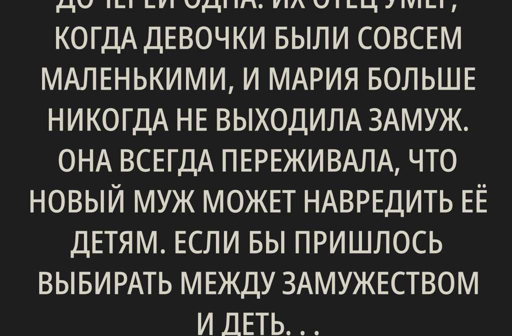 Мария воспитывала своих двух дочерей одна. Их отец умер, когда девочки были совсем маленькими, и Мария больше никогда не выходила замуж. Она всегда переживала, что новый муж может навредить её детям. Если бы пришлось выбирать между замужеством и детьми, она без сомнений выбрала бы детей.