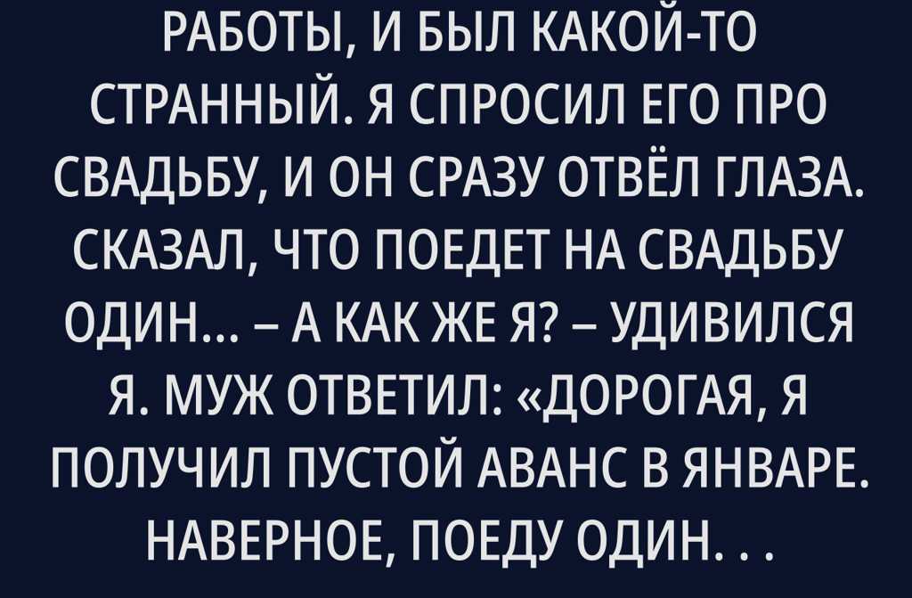 Муж ответил: «Дорогая, я получил пустой аванс в январе. Наверное, поеду один на свадьбу. Ты останешься дома с ребёнком. Ничего страшного не случится. Я уеду на три дня, придётся жить в гостинице, поесть что-то. И конечно, нужно купить подарок молодожёнам».