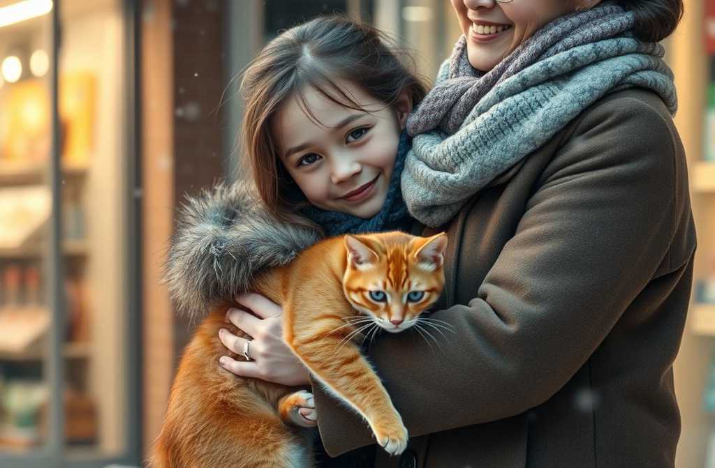 Люди входили и выходили, двери хлопали, а у входа в магазин сидел рыжий кот. Он щурился, будто знал всё на свете, и лишь перебирал лапами от холода. Аля присела рядом, помахала тёте, чтобы та шла без неё.