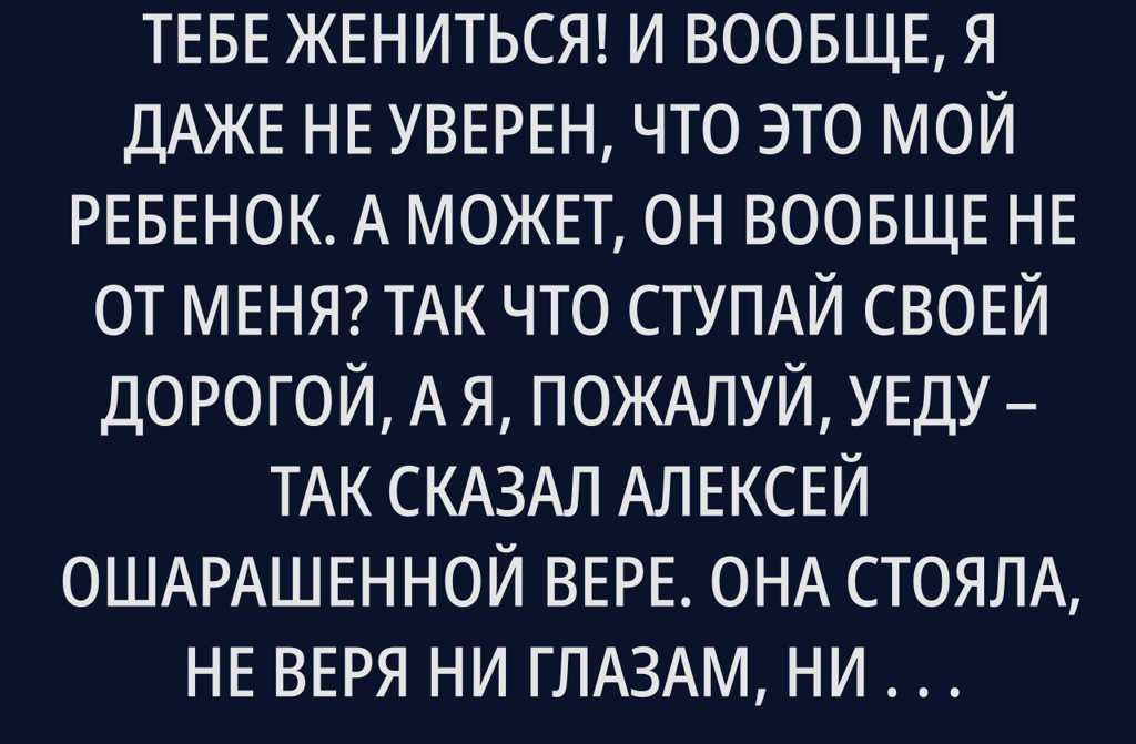 А может, он вообще не от меня? Так что ступай своей дорогой, а я, пожалуй, уеду так сказал Алексей ошарашенной Вере.