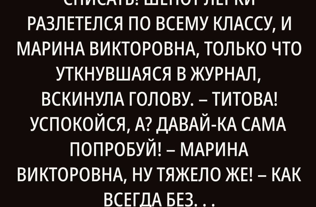 Шёпот Лерки разлетелся по всему классу, и Марина Викторовна, только что уткнувшаяся в журнал, вскинула голову.