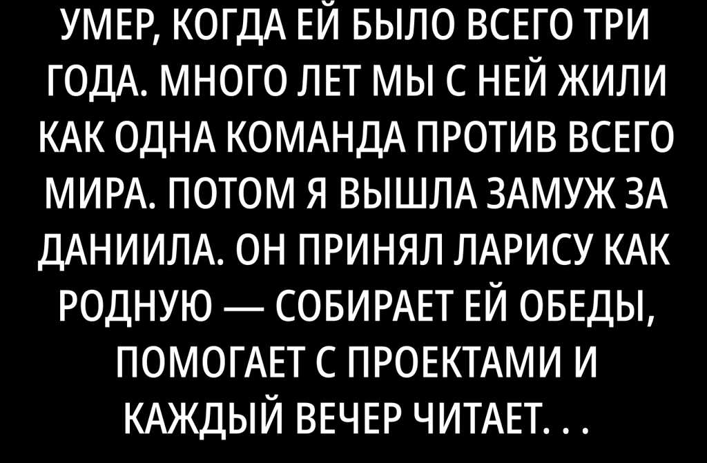 Потом я вышла замуж за Даниила. Он принял Ларису как родную собирает ей обеды, помогает с проектами и каждый вечер читает любимые сказки.