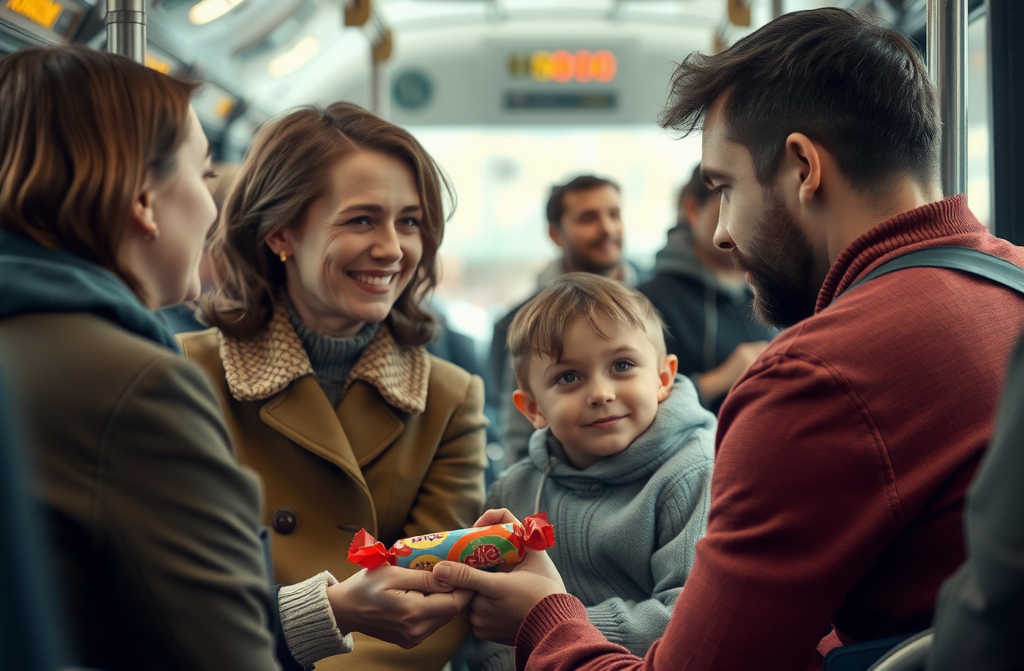 Автобус был переполнен. Я заметила молодого человека, слушавшего музыку в наушниках, и попросила его уступить нам место. Парень сразу же поднялся, а мы с сыном сели. В знак благодарности мой сын дал ему конфету. Молодой человек смутился, улыбнулся и кивнул.