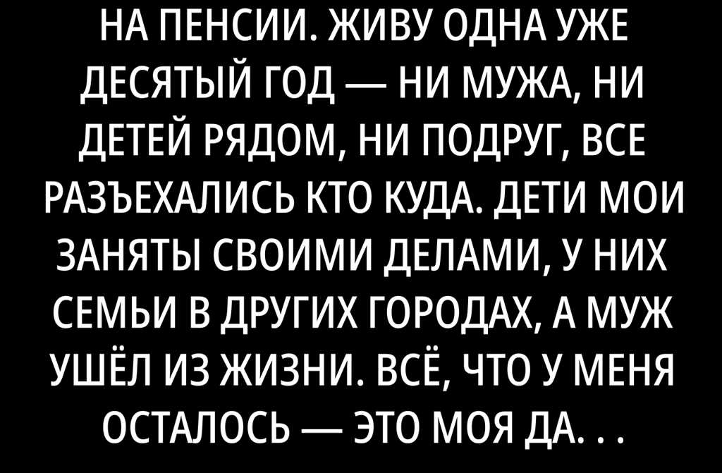 Мне шестьдесят лет, уже давно на пенсии. Живу одна уже десятый год ни мужа, ни детей рядом, ни подруг, все разъехались кто куда. Дети мои заняты своими делами, у них семьи в других городах, а муж ушёл из жизни. Всё, что у меня осталось это моя дача в пригороде Киева, она моя радость и отдушина. Как только потеплеет и снег сойдёт, перебираюсь туда: убираю дом, привожу в порядок участок, высаживаю рассаду. Там мне действительно спокойно и уютно.