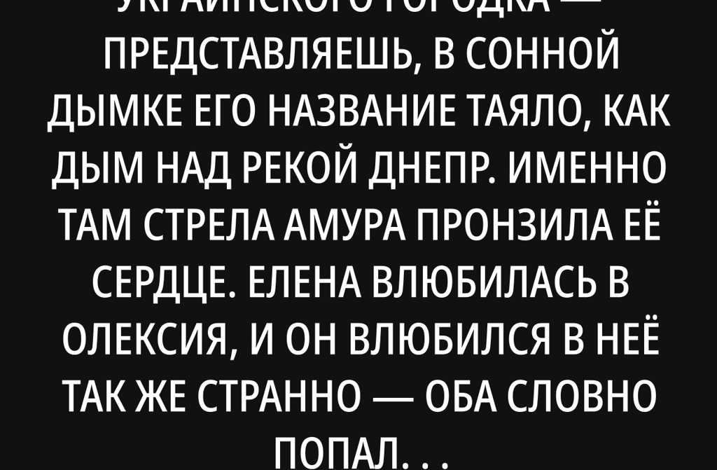 Елена приехала из небольшого украинского городка представляешь, в сонной дымке его название таяло, как дым над рекой Днепр. Именно там стрела Амура пронзила её сердце. Елена влюбилась в Олексия, и он влюбился в неё так же странно оба словно попали в водоворот сна. Потом им пришло в голову тайно покинуть свою малую родину, в чем-то даже сбежать от неё, как убегают герои русских народных былин.