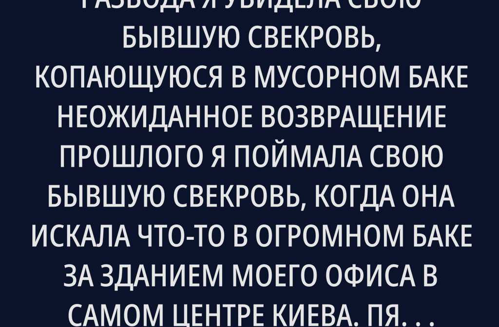 Я поймала свою бывшую свекровь, когда она искала что-то в огромном баке за зданием моего офиса в самом центре Киева. Пятнадцать лет назад она была единственной, кто встал на мою сторону во время мучительного развода. Тогда казалось: прошлое исчезло навсегда, но её рассказ перевернул мою жизнь и не оставил шансов остаться в стороне.