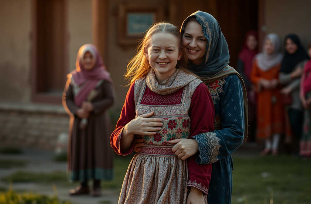 В закатном солнце оно сияет необыкновенным светом. Атлас по фигуре, кружево на плечах переливается. Но главное как Люба идёт, держит голову прямо, в глазах спокойная сила, мудрость. Мать ведёт с такой бережностью, будто хрустальную вазу будто всем говорит: “Это моя мама. Я ею горжусь”.