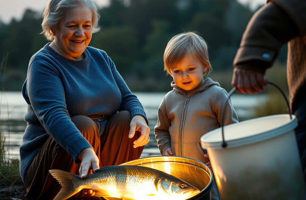 Вдруг поплавок резко дернул вниз. Сжав зубы, она начала поднимать леску, пока щука, блеснув в воздухе, не упала в её ведёрко.