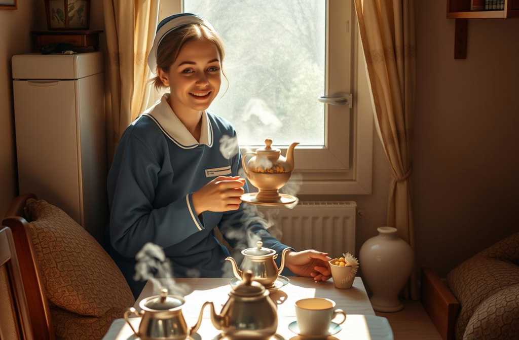 Девушка делает её уютной: вешает лёгкие шторы, ставит на подоконник цветущий герань, раскладывает яркую скатерть на стол, покупает две красные кастрюли в белый горох и ещё немного посуды.