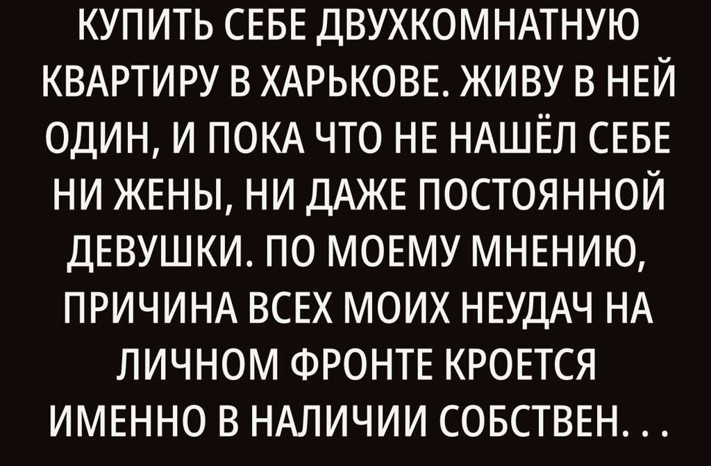 В тридцать лет я смог, наконец, купить себе двухкомнатную квартиру в Харькове. Живу в ней один, и пока что не нашёл себе ни жены, ни даже постоянной девушки. По моему мнению, причина всех моих неудач на личном фронте кроется именно в наличии собственной квартиры.