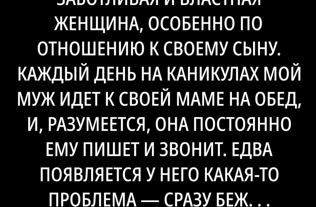 Моя свекровь очень заботливая и властная женщина, особенно по отношению к своему сыну. Каждый день на каникулах мой муж идет к своей маме на обед, и, разумеется, она постоянно ему пишет и звонит. Едва появляется у него какая-то проблема сразу бежит к маме на совет. Деньги нужны к маме.
