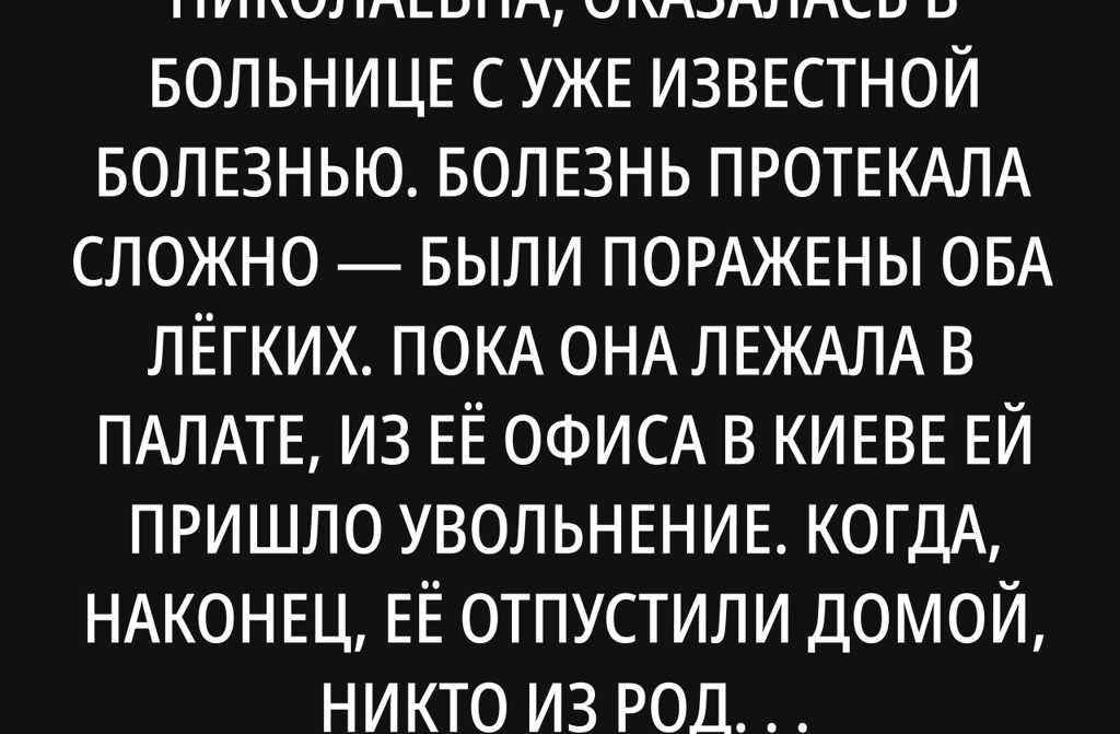 Моя подруга, Ярослава Николаевна, оказалась в больнице с уже известной болезнью. Болезнь протекала сложно были поражены оба лёгких. Пока она лежала в палате, из её офиса в Киеве ей пришло увольнение. Когда, наконец, её отпустили домой, никто из родных и близких даже не намекнул, что нужно немедленно искать новую работу. Тем более что по всей стране творился хаос, люди держались за свои должности из последних сил. Найти хорошее место с достойной зарплатой в таких условиях было нереально, а становиться кассиром в супермаркете после всего пережитого и с её здоровьем Ярослава просто не могла. Поэтому тихо искала что-то по своей специальности, надеясь, что доведётся поработать хотя бы удалённо.