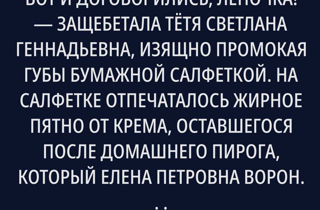 Она пошла на кухню, поставила себе еды и кусок бисквитного торта. Заварила свежий чай, села за стол, смотрела в окно на тополь, ела медленно, с чувством, без спешки. Телефон долго не брала только через пару часов взглянула: сообщения от Оленьки, Кости, Тамары Степановны (стулья когда вернуть?). Ответила только Тамаре: Завтра принесу, извиняюсь за неудобство.