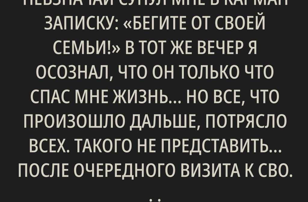 После приема врач будто бы невзначай сунул мне в карман записку: «Бегите от своей семьи!» В тот же вечер я осознал, что он только что спас мне жизнь… Но все, что произошло дальше, потрясло всех. Такого не представить