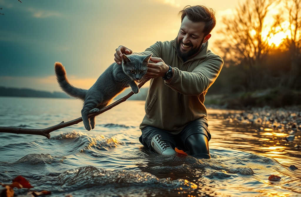 Кошка, будто поняв, прыгнула к нему и вцепилась когтями в плечо. Боль пронзила его, но он только выдохнул: *«Держись»*. Развернулся и пошёл обратно, с трудом переставляя ноги. Холод парализовал тело, протез мешал, силы таяли. Гул воды нарастал волна была уже за спиной. Михаил почувствовал под ногами дно, сделал ещё шаг и рухнул, теряя сознание. Последнее, что он увидел: кошка прыгнула на берег.