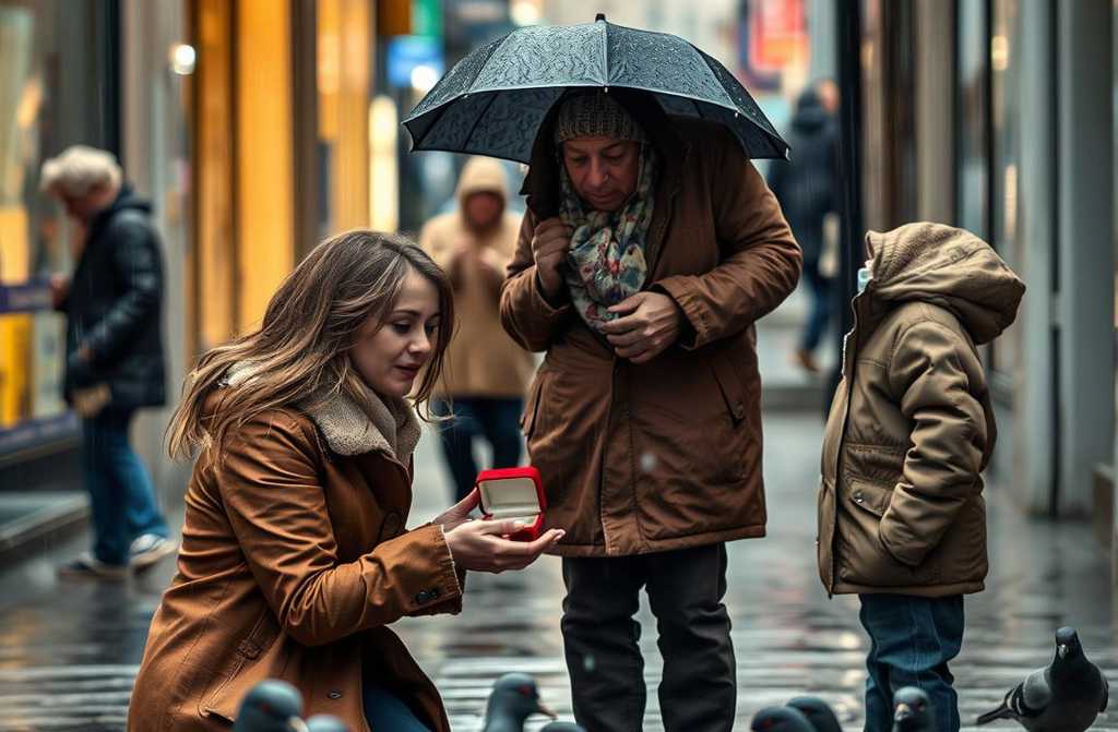 Небо слегка моросит, словно тонкий занавес дождя, а люди спешат мимо, прячась под зонтами и опустив глаза. Никто не замечает женщину в бежевом костюме, стоящую на коленях посреди перекрёстка. Её голос дрожит. «Пожалуйста выйди за меня замуж», шепчет она, сжимая бархатную коробочку. Мужчина, которому она делает предложение? Он не брился неделями, носит пальто, залатанное скотчем, и спит в переулке всего в квартале от Садового кольца.