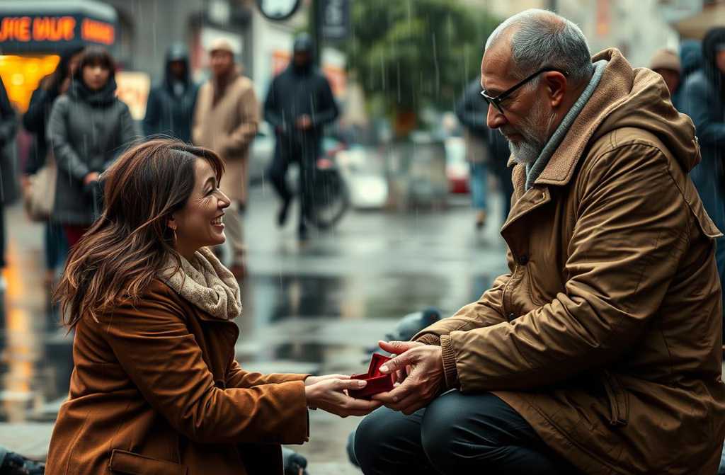 Лёгкий дождь струился с неба, словно прозрачная вуаль, пока люди спешили по улице, прячась под зонтами. Но никто не обратил внимания на женщину в бежевом пальто, стоящую на коленях посреди перекрёстка. Её руки дрожали, сжимая бархатную шкатулку. «Прошу тебя… выйди за меня замуж», прошептала она. Мужчина перед ней? Небритый, в потрёпанном пальто, зашитом изолентой, он ночевал в подворотне всего в квартале от Московского международного делового центра.