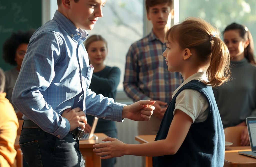Иван шагнул к Вере, взял её за руку и аккуратно вывел из класса. Когда они вернулись, учитель взорвался упрёками, обвиняя обоих в неприличном поведении и заступившись за авторитет. Этот момент навсегда отпечатается в моей памяти.