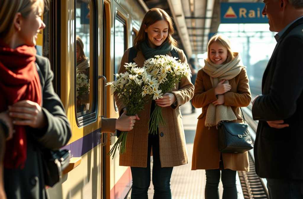 Вот и вокзал. Злата быстро прощается с Алексеем, целует его в щёку. Увидев своих встречающих, радостно машет им и выбегает на платформу. На перроне стоит внушительный мужчина с двумя мальчиками, в руках огромный букет белых хризантем.