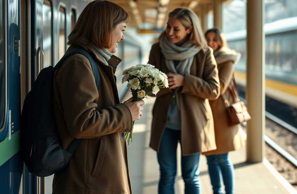 Ночью они прощались, а утром поезд приближался к станции. Аглая привела себя в порядок, ждала встречи с семьёй, а Алексей, видя её подготовку, чуть ревновал. На перроне стоял её муж с двумя мальчиками, в руках огромный букет белых хризантем.