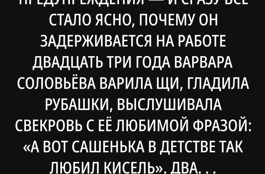 Двадцать три года Варвара Соловьёва варила щи, гладила рубашки, выслушивала свекровь с её любимой фразой: «А вот Сашенька в детстве так любил кисель». Двадцать три года она верила, что муж задерживается на работе по уважительной причине. Мало ли что отчёт, совещание, форс-мажор. Всё понятно, всё объяснимо.