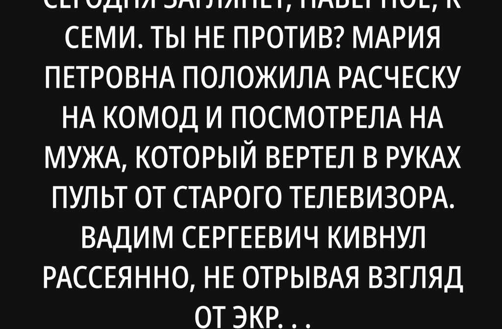 Мария Петровна положила расческу на комод и посмотрела на мужа, который вертел в руках пульт от старого телевизора. Вадим Сергеевич кивнул рассеянно, не отрывая взгляд от экрана: